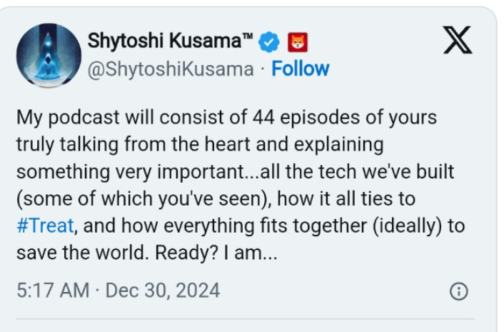 Shytoshi Kusama svela “Shy Speaks”, una serie di podcast di 44 episodi, offrendo approfondimenti sul Shiba Inu e sul token $TREAT.