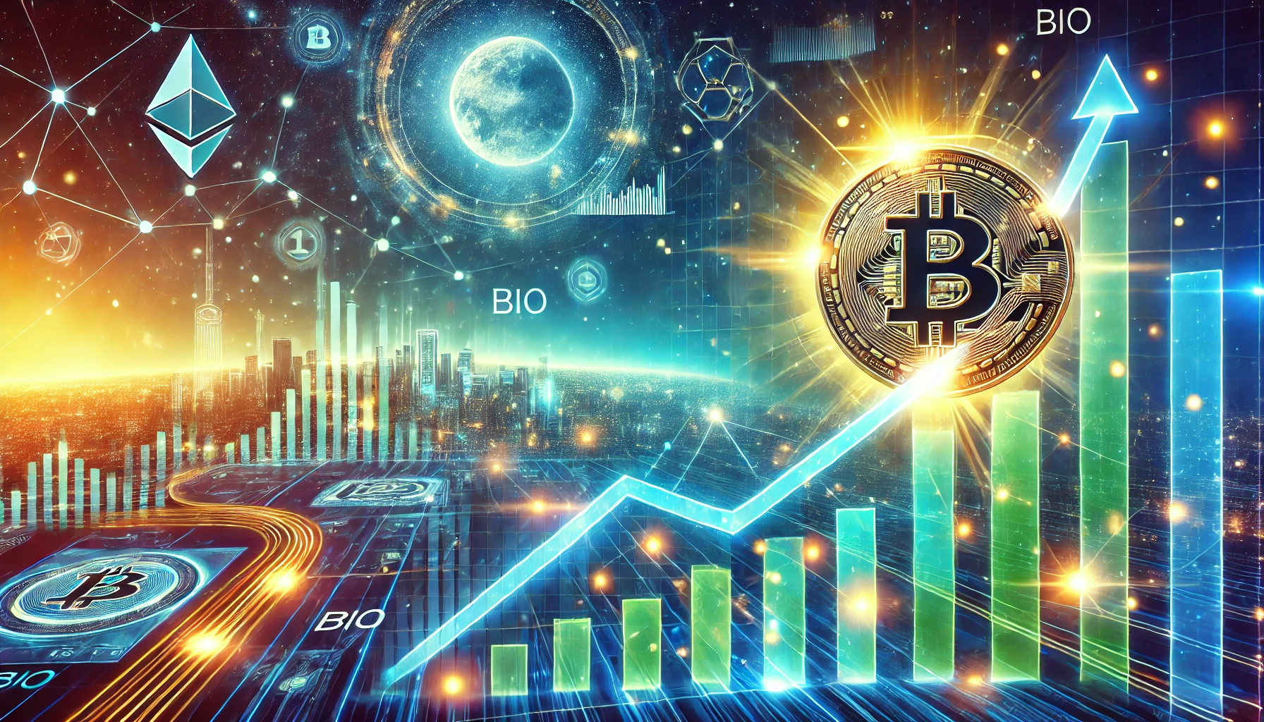 Questa immagine rappresenta l'ottimismo e il potenziale che circondano l'ascesa di BIO Coin, raffigurandolo come un asset digitale luminoso in aumento di valore.
