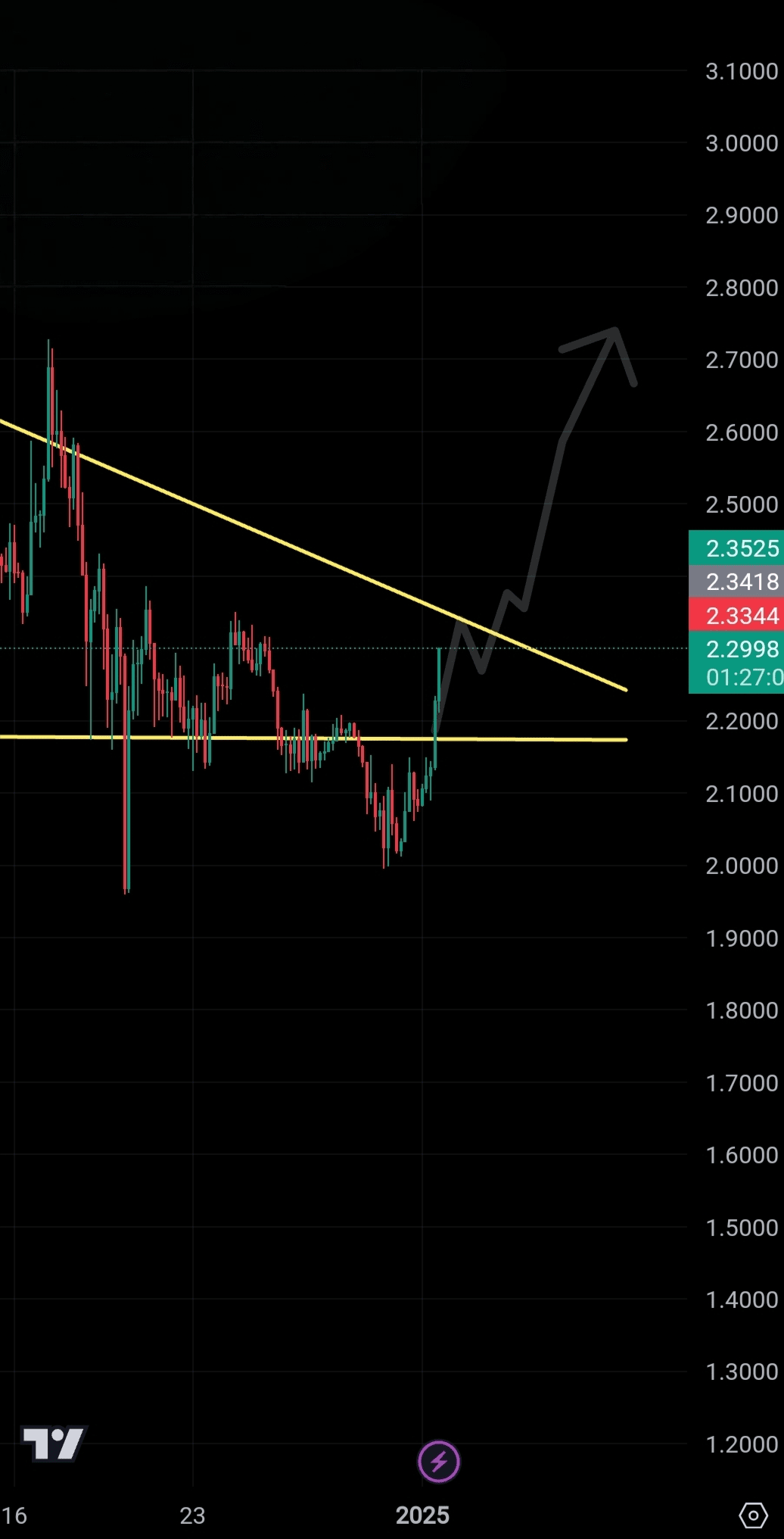 Ho trovato la prossima moneta $XRP se ti ricordi avevo previsto che XRP sarebbe sceso leggermente dal modello del triangolo simmetrico che ho disegnato e ora è di nuovo in aumento dopo essere rimbalzato fortemente.