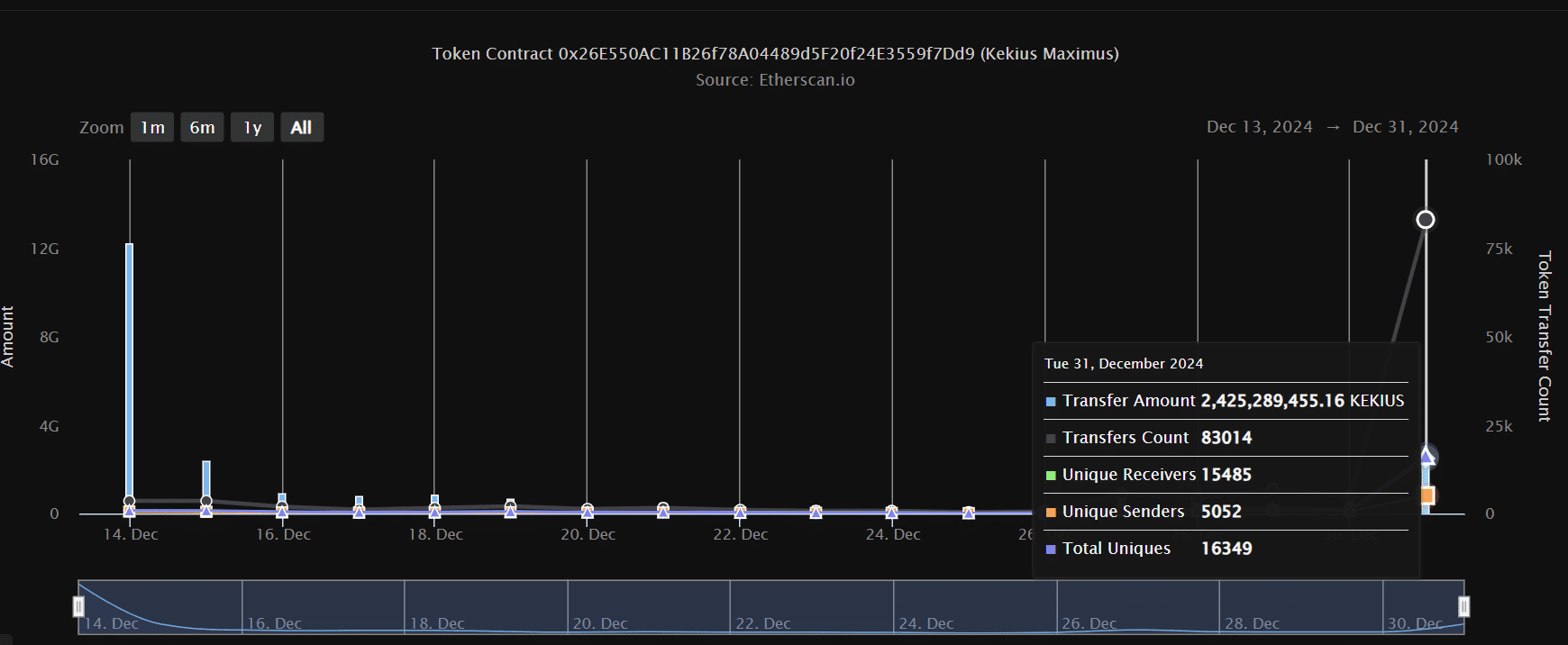 KEKIUS ha registrato il suo più grande aumento la vigilia di Capodanno. Secondo i dati di Etherscan, un incredibile numero di 2,4 miliardi di token KEKIUS sono stati trasferiti tra gli utenti in un solo giorno. Il numero di detentori del token è ora cresciuto a oltre 22.000.