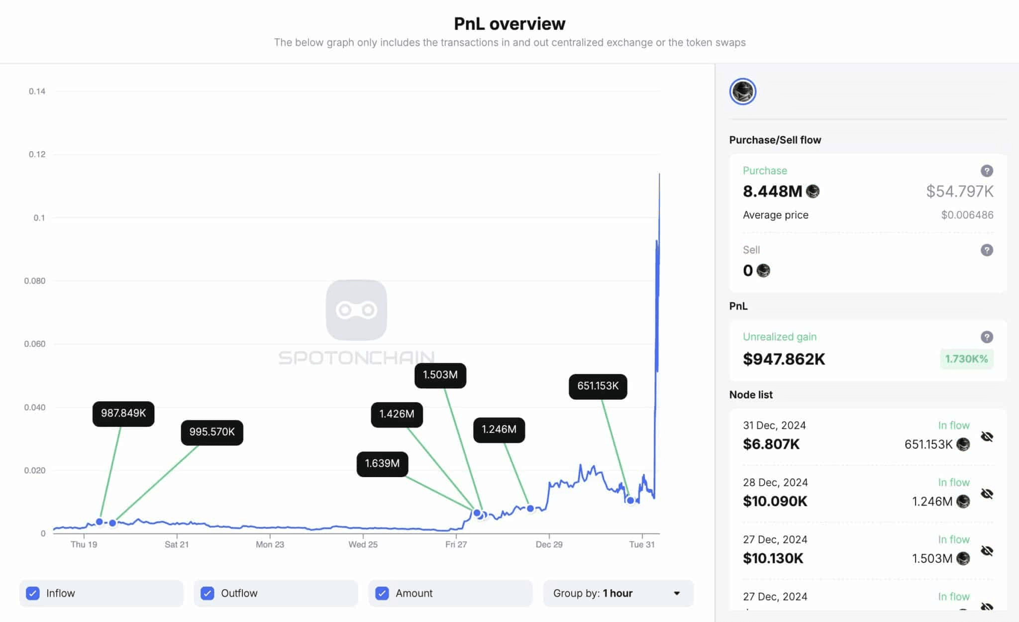 “Un trader con l'indirizzo 0x33A ha trasformato $54.800 in $1 milione utilizzando KEKIUS! Tra il 19 dicembre e 15 ore fa, ha speso 16 ETH ($54.8k) per 8.448 milioni di token KEKIUS. Dopo 12 giorni, ha registrato un profitto di $948k (17.3x),” ha dichiarato il rapporto.