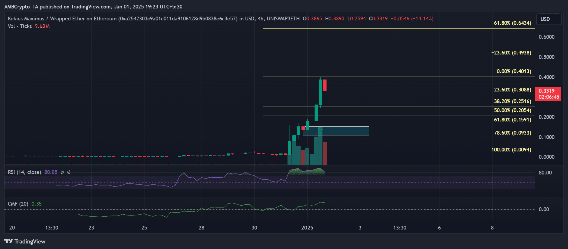 Nel grafico dei prezzi, KEKIUS ha visto una significativa presa di profitto intorno a $0.40. Tuttavia, il lungo gambo inferiore della candela suggerisce che esiste ancora una forte domanda per questa memecoin.