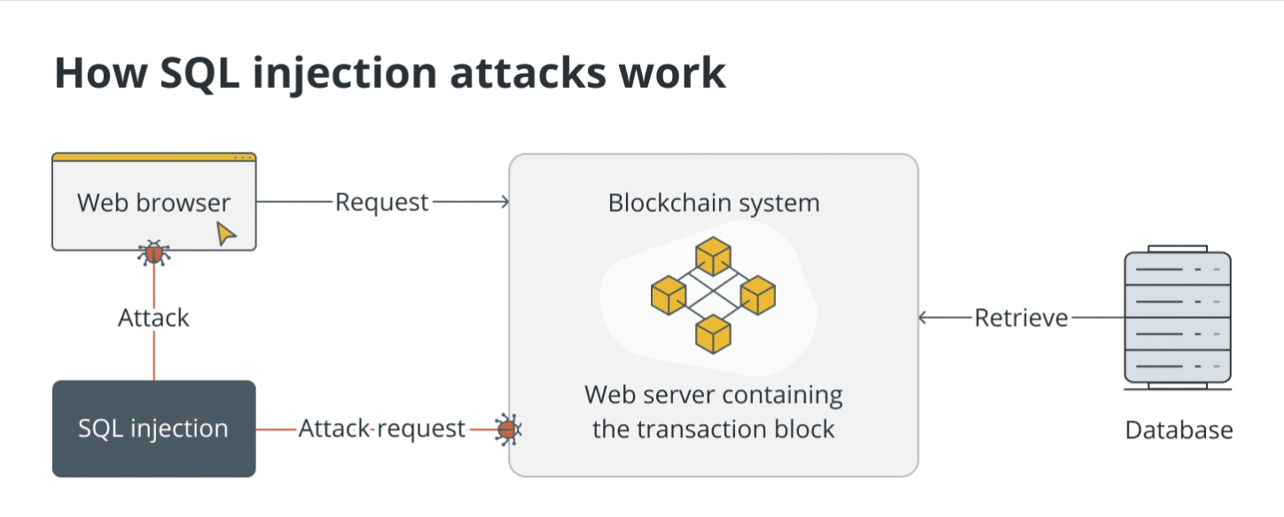 Sebbene la tecnologia sottostante della blockchain sia intrinsecamente sicura, le app sviluppate su di essa utilizzano frequentemente il Linguaggio di Query Strutturato (SQL) per comunicare con database convenzionali. Questi luoghi di interazione sono l'obiettivo di un attacco di SQL injection. Questi attacchi sfruttano vulnerabilità nel modo in cui un'applicazione elabora l'input dell'utente.