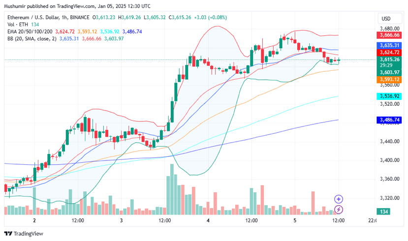 L'Indice di Forza Relativa (RSI) è a 75.5, segnalando che ETH è nella zona di ipercomprato. Ciò significa che ETH potrebbe prendersi una pausa presto, ma il forte slancio degli acquisti suggerisce che i tori non sono ancora pronti a ritirarsi.