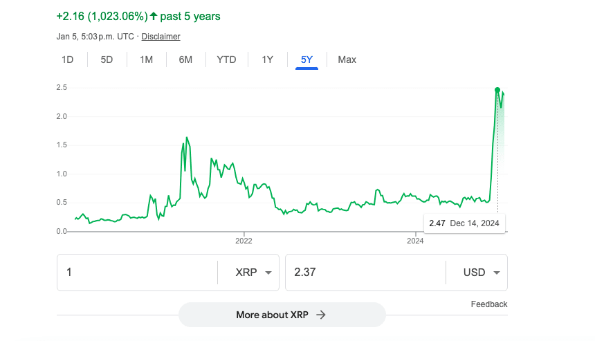 Il percorso del prezzo di XRP è stato tutt'altro che stabile. Nel 2017, è schizzato da circa $0.006 a un incredibile massimo di $3.84 solo un anno dopo. Tuttavia, questa crescita meteoritica è stata seguita da un forte calo, con i prezzi che sono scesi a circa $0.20 nel 2019. Da allora, XRP ha visto una miscela di stabilità con occasionali fluttuazioni a breve termine.