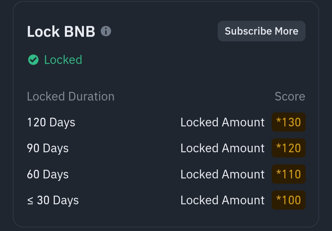 1. Blocca BNB per guadagnare punti: gli utenti bloccano i loro BNB in โโprodotti a tempo determinato su Binance Simple Earn. I punti vengono guadagnati in base alla quantitร di BNB bloccati e alla durata del periodo di abbonamento.