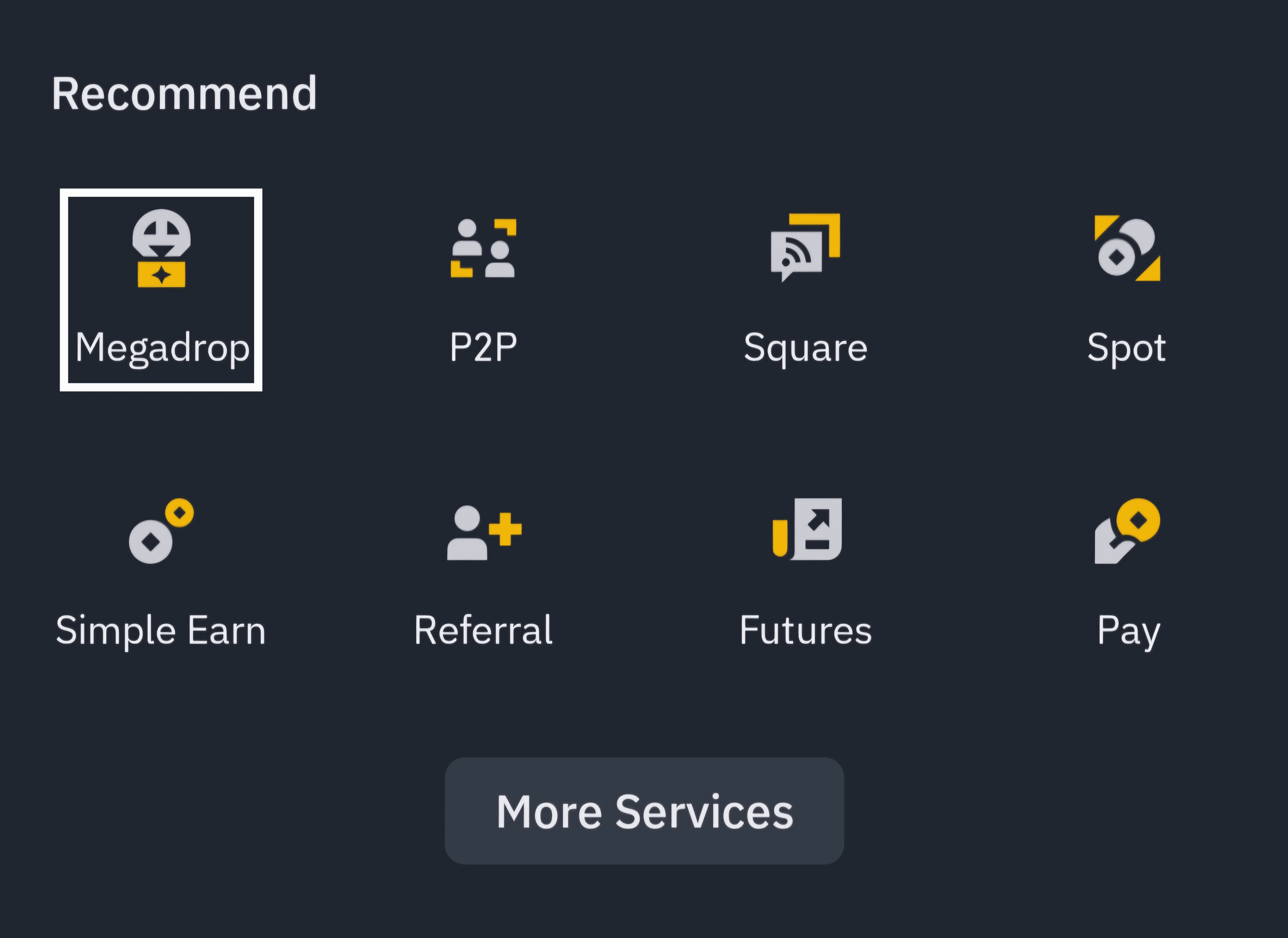 1. Accedi al tuo account Binance sull'app mobile, quindi cerca l'icona [Megadrop]. Se non riesci a vederlo, vai su [Altri servizi].