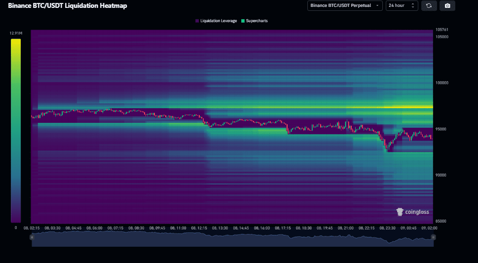 La mappa di calore della liquidazione Binance BTC/USDT mostra un cluster di zone ad alta liquidità attorno a $95.000, che mostra forti livelli di supporto. Questo è indicativo che Bitcoin è pronto per una traiettoria rialzista nel lungo termine. Continuo sviluppo della liquidità e meno pressione di vendita sviluppano fiducia nel potenziale al rialzo di Bitcoin.