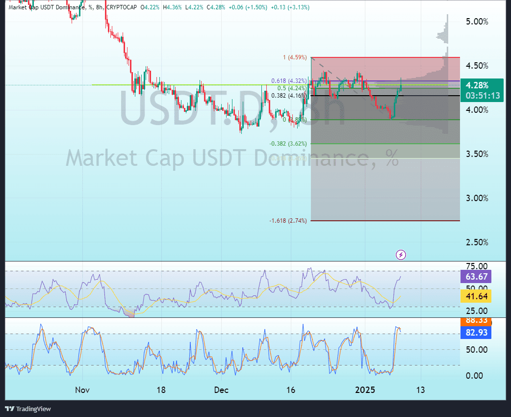 Il grafico della Dominanza USDT ha una resistenza al 4,32% di Fibonacci, dalla quale il grafico potrebbe essere respinto. L'RSI si avvicina a livelli di ipercomprato e potrebbe indebolire il momentum. Al contrario, il grafico giornaliero di BTC ha mostrato un modello di triplo fondo da manuale, forte inversione rialzista. La contrazione delle Bande di Bollinger potrebbe indicare un imminente movimento dei prezzi. Nel frattempo, il momentum al rialzo nello Stocastico RSI mostra che la pressione di acquisto sta aumentando. Se la dominanza USDT inizia a scendere, questo potrebbe alimentare il più grande rally di Bitcoin, che potrebbe spingerlo verso l'obiettivo di $110K. Questo fa sì che le indicazioni si allineino molto fortemente con il caso per un imminente pump.