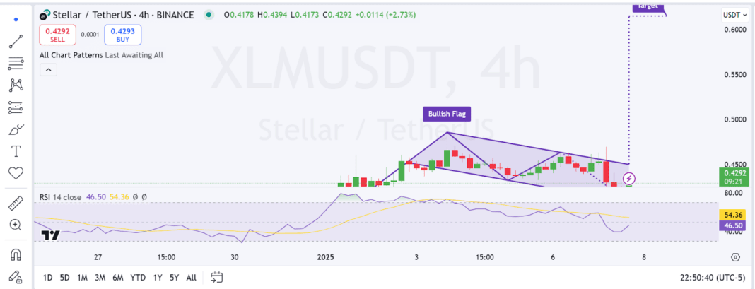 Il grafico XLM/USDT a 4 ore mostra un modello di bandiera rialzista. Proietta un obiettivo a breve termine di $0.60.