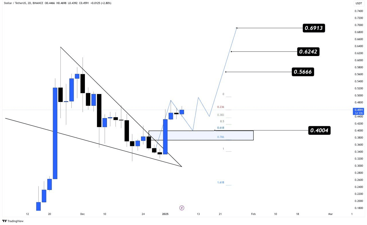 Stellar ($XLM ) ha catturato l'attenzione dopo essere uscita da un modello di wedge decrescente. Segnala una potenziale continuazione rialzista. Con obiettivi a $0.5666, $0.6242 e $1, gli analisti di mercato stanno monitorando attentamente il livello di supporto critico a $0.40 per sostenere il rally.