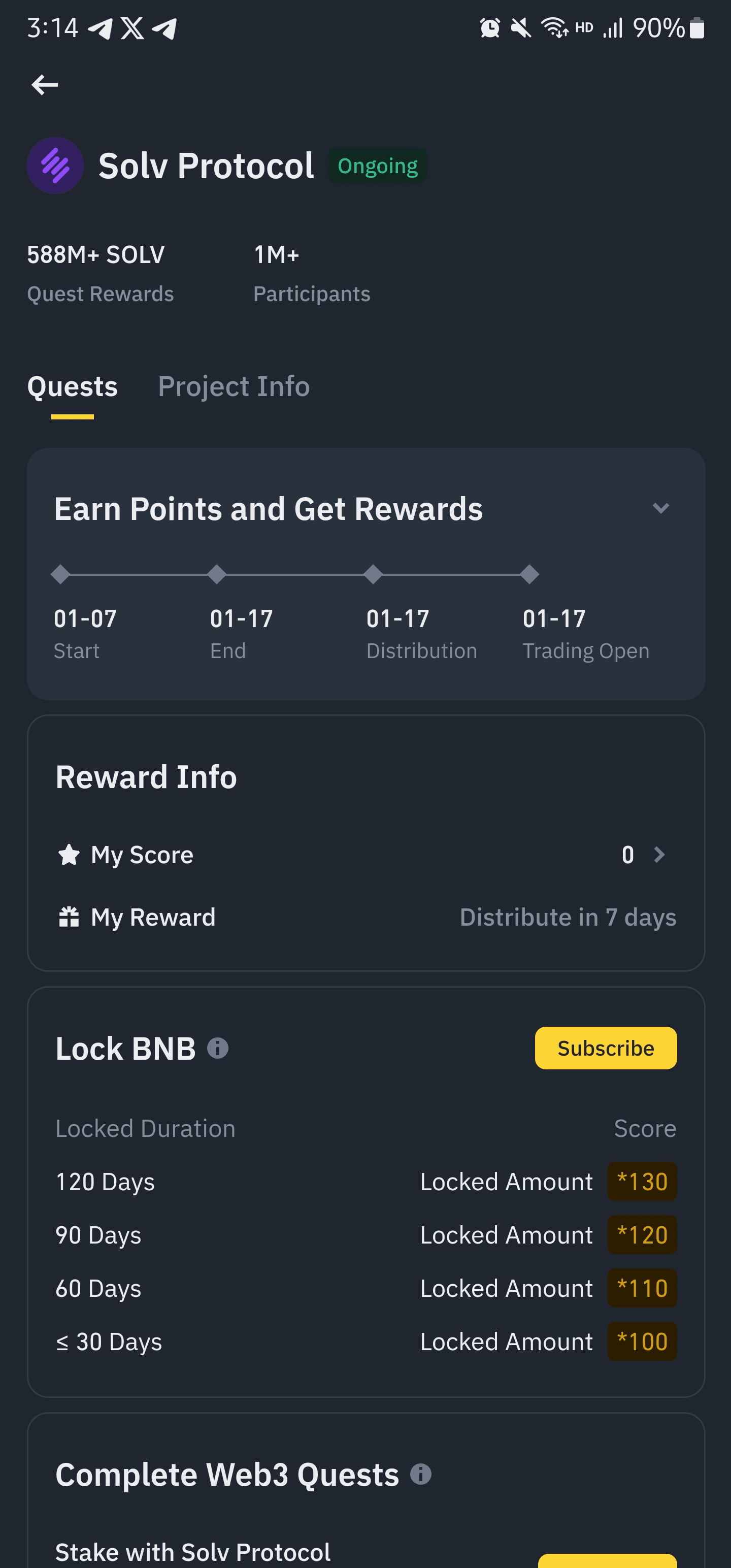 Per la persona che vuole provare la quest web3. Devi avere bnb sulla rete binansmart chain almeno 2$ pensa (dimentica questo) e il btc su binance smart chain almeno 0.00011btc per stackare su solv protocol. Dopo aver stackato con successo il tuo btc su solv, devi tornare a verificare che hai completato il tuo processo. Riceverai 500 punti sulla quest web 3