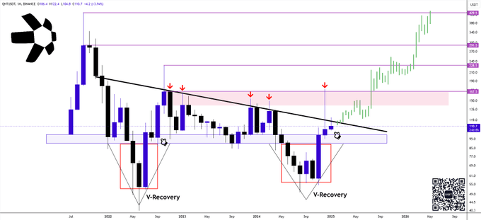 La capitalizzazione di mercato attualmente si attesta a $1.48B, con un'offerta circolante di 15 milioni di QNT. Gli analisti credono che i recenti ribassi facciano parte di un accumulo, come visto nei passati recuperi a forma di V nel maggio 2022 e nel dicembre 2024.