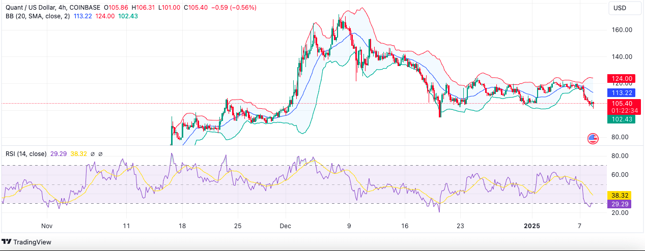 RSI: A 29.29, QNT è nella regione di ipervenduto, suggerendo un potenziale rimbalzo se aumenta la pressione d'acquisto. Tuttavia, un RSI sotto 50 conferma il sentiment ribassista prevalente.