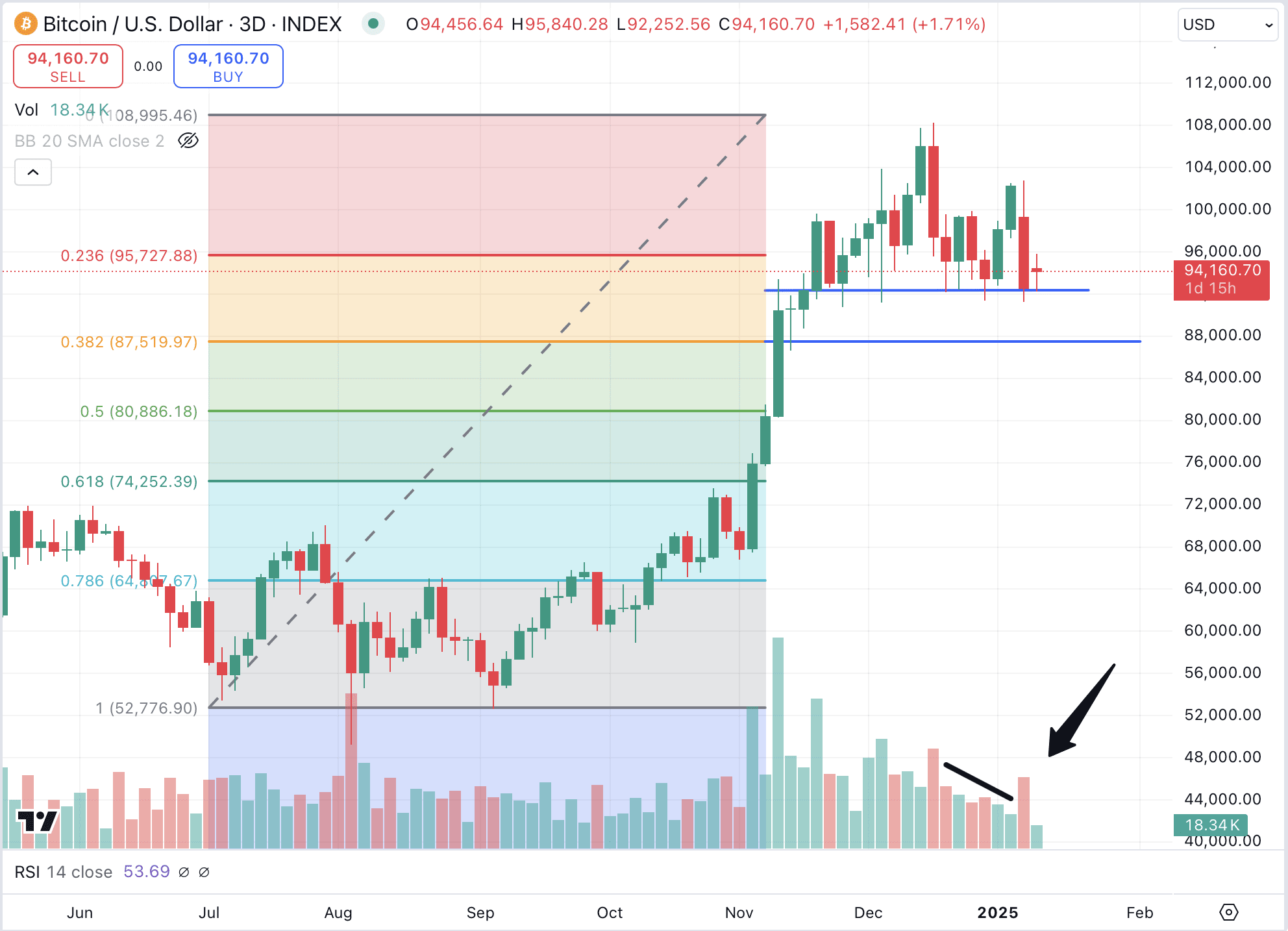 Scenario 1 (60% di probabilità): $BTC scende ulteriormente al livello di supporto chiave di $87.000. Questa è una zona di supporto forte che si allinea con il 0.382 di Fibonacci e potrebbe fungere da prossimo punto di fermo.
