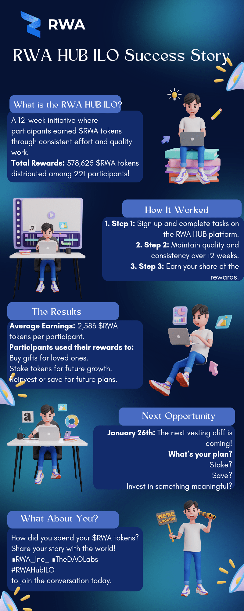 Il RWA HUB ILO è stata un'iniziativa in cui i partecipanti hanno completato compiti, sono rimasti costanti e hanno dimostrato un lavoro di alta qualità per 12 settimane. In cambio, hanno guadagnato $RWA token, aprendo porte a nuove possibilità nel mondo degli asset tokenizzati.