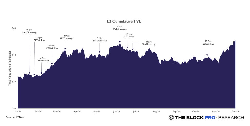 Nel 2024, l'industria Layer2 ha fatto notevoli progressi, con molti mainnet avviati e airdrop di token che hanno attirato nuova attenzione. Il valore totale bloccato (TVL) è cresciuto da 22,4 miliardi di dollari a 42,8 miliardi di dollari, mentre il volume totale delle transazioni mensili è aumentato da 169 milioni a 562 milioni, mostrando una continua crescita dell'attività degli utenti.