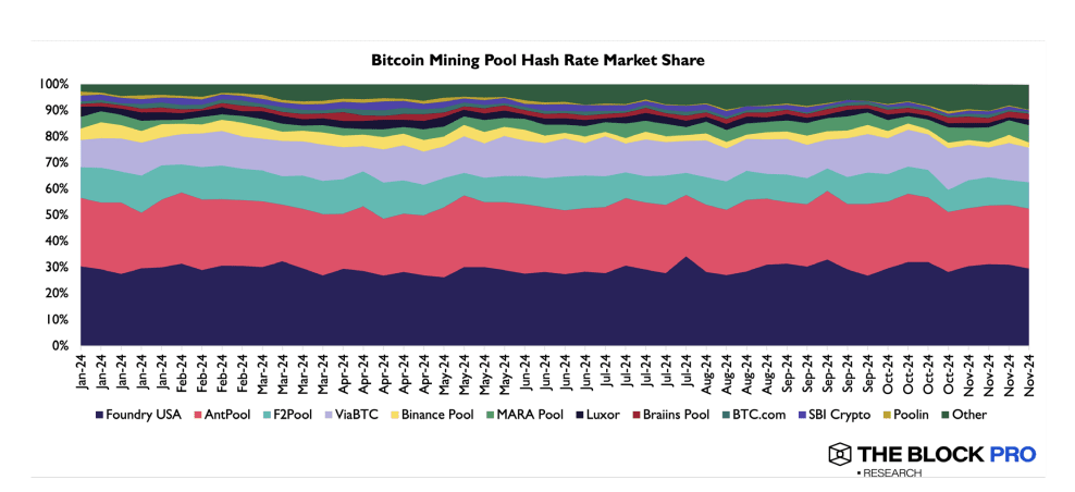 Da notare che la composizione dei ricavi dei minatori è cambiata, con le commissioni delle transazioni di asset on-chain che a dicembre 2023 hanno superato il 1/5, indicando che la natura delle attività on-chain di Bitcoin sta cambiando. Tuttavia, rimane il problema della concentrazione nei pool minerari, con Foundry USA e Antpool che controllano oltre il 50% della potenza di calcolo, sollevando preoccupazioni per la revisione delle transazioni.