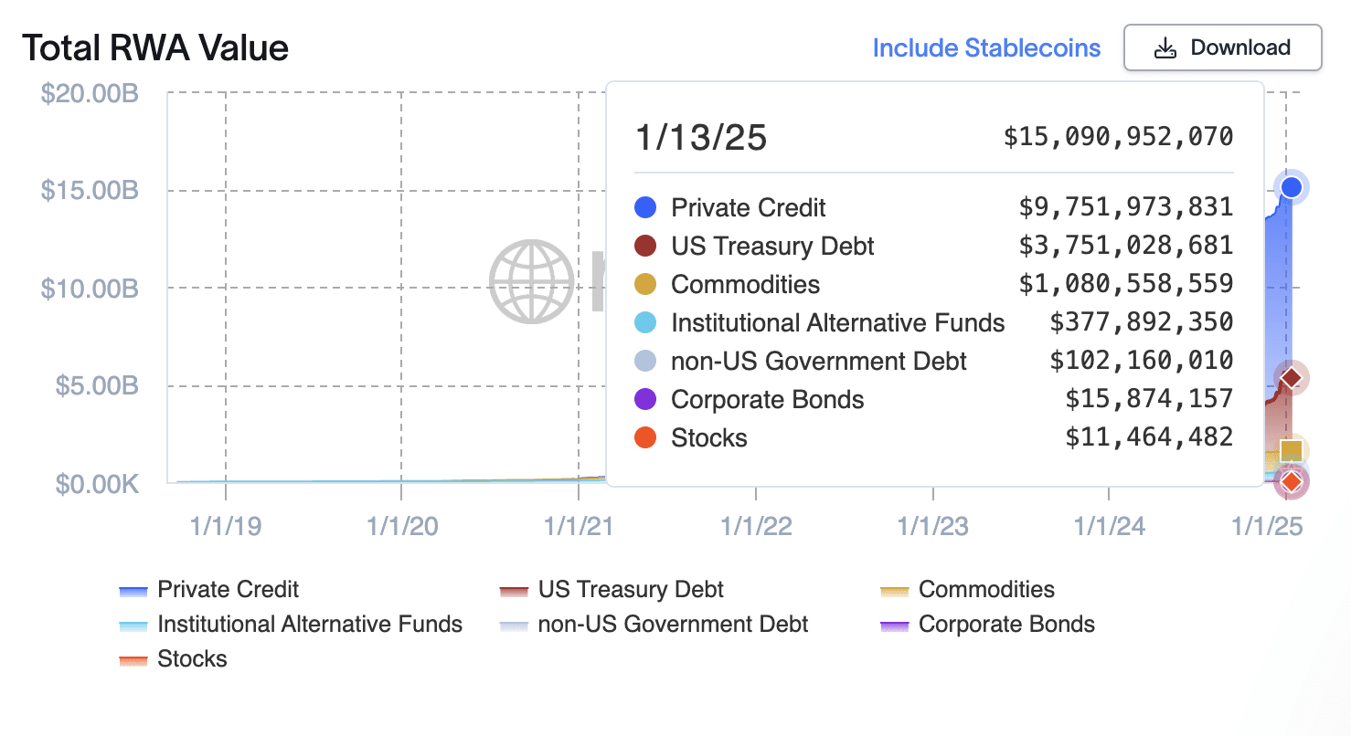 Poiché i dati RWA delle varie piattaforme mostrano notevoli discrepanze, in basso cito direttamente i dati di rwa.xyz, con i dati fino al 13 gennaio, la capitalizzazione totale di RWA ha raggiunto i 15,09 miliardi di dollari. (Con evidenti differenze rispetto ai dati precedenti di The Block.)