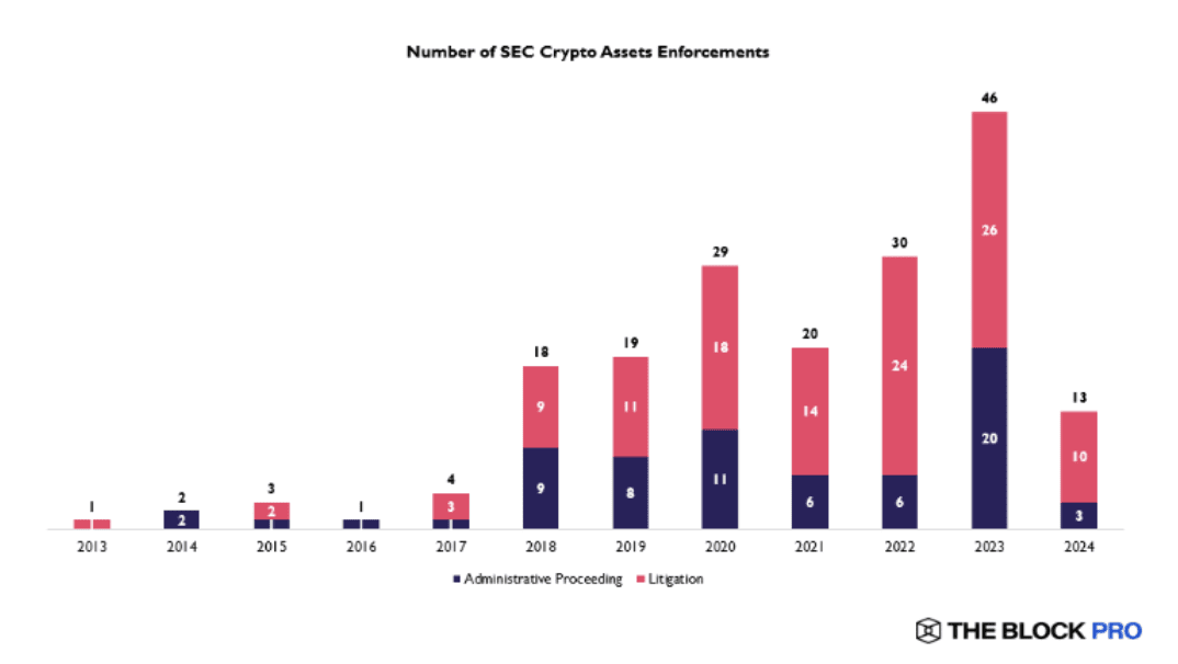 Inoltre, l'attuale presidente della SEC, Gary Gensler, lascerà il suo incarico dopo l'elezione di Trump, e il cambiamento di leadership simboleggia un punto di svolta cruciale nella regolamentazione delle criptovalute negli Stati Uniti, preparando il terreno per significative riforme normative. Sotto la direzione di Gensler, oltre la metà delle azioni di enforcement della SEC sulle criptovalute dal 2015 si sono verificate durante il suo mandato.