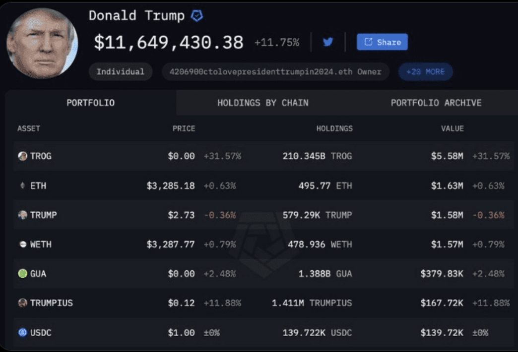 L'emergere di Donald Trump come "presidente delle meme coin" è uno sviluppo sorprendente per un leader che in precedenza aveva definito le criptovalute una truffa. Secondo un recente rapporto di Arkham Intelligence, il portafoglio di Trump ora contiene oltre 8 milioni di dollari in meme coin. Possiede 5,5 milioni di dollari in #TROG , un token divertente associato alle sottoculture di Internet. Ha 1,5 milioni di dollari in token #TRUMP direttamente associati alla sua persona. Il suo portafoglio include anche 1,3 miliardi di token GUA, del valore di circa 400.000 dollari, e un altro token costruito attorno al suo marchio, #trumpius , del valore di 167.000 dollari.