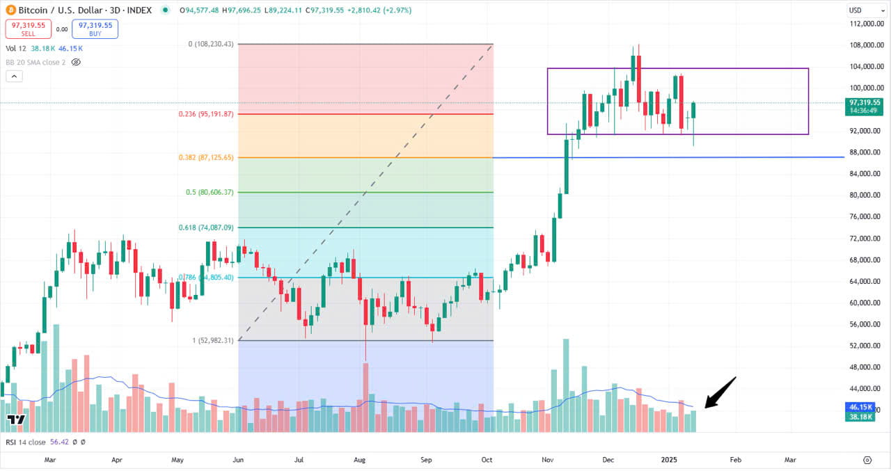 Dopo un "flash dump" a $89,000, $BTC si è ripreso sul timeframe 3D (vedi grafico 👇) con un volume di scambi significativo. Tuttavia, questo è ancora considerato un rimbalzo tecnico, e BTC rimane all'interno della zona di accumulo di $91,000 - $104,000 (vedi grafico 👇).