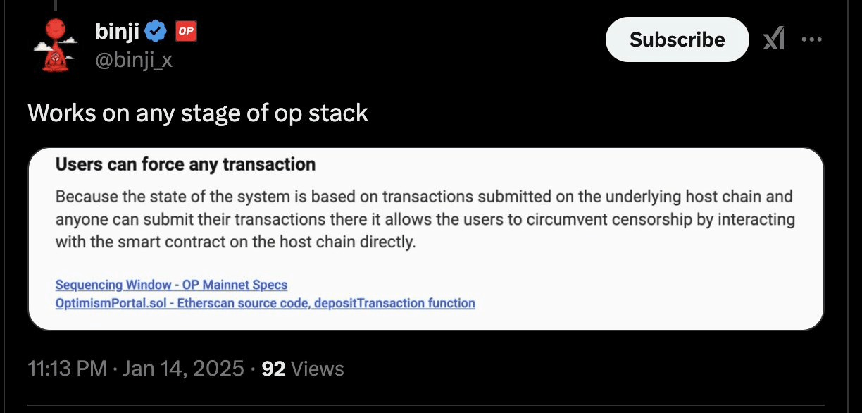 Lo Stack #OP , un framework modulare utilizzato da più L2, garantisce che ogni transazione elaborata su un L2 sia ancorata nel L1 di Ethereum. Questo design rende quasi impossibile per gli L2 censurare permanentemente le transazioni, poiché gli utenti possono sempre tornare alla mainnet di Ethereum per eseguire le loro transazioni.