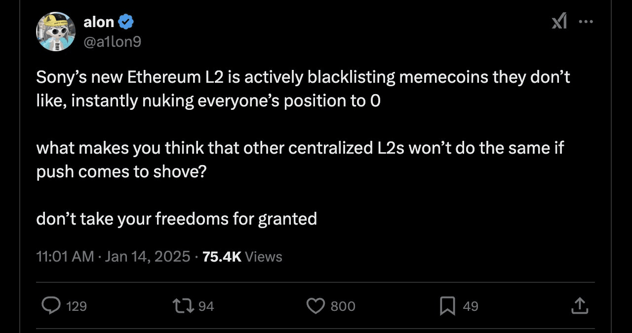 Il recente lancio della rete Layer 2 (L2) di #Sony ha portato con sé una controversia inaspettata, mettendo in mostra una caratteristica critica di #OPStack : la resistenza alla censura. Nel giro di sole 24 ore, un tentativo di Sony di bloccare alcuni token si è svelato in modo drammatico, dimostrando la solidità dei principi fondamentali di Ethereum. Ecco una ripartizione dettagliata degli eventi.