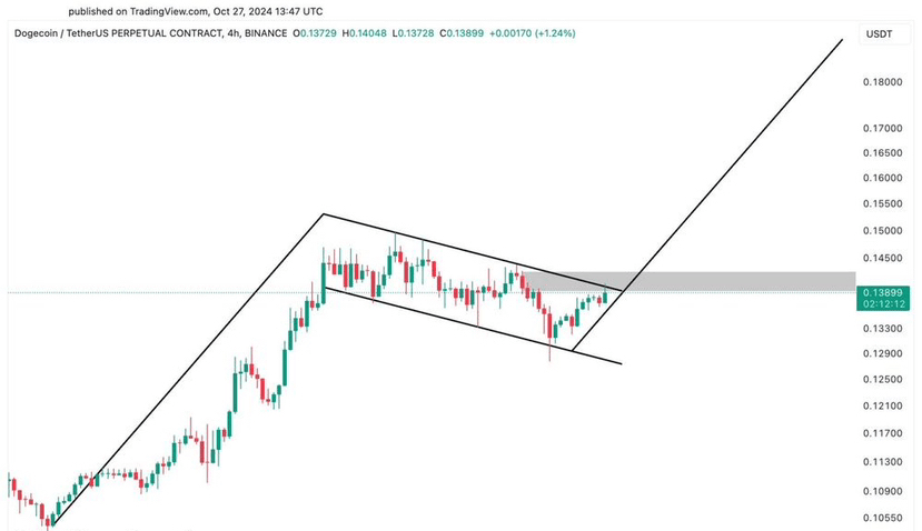 Nel contesto della ripresa del mercato delle criptovalute, Dogecoin (DOGE) è aumentato del 3%, attualmente scambiato a $0.38, con volumi di scambio in aumento del 18% e che superano i $4 miliardi. Il grafico tecnico di Dogecoin mostra un setup familiare rispetto al grande rally visto nel 2021, portando molti analisti a credere che Dogecoin potrebbe essere in procinto di un rally di 10 volte fino a $3.0.