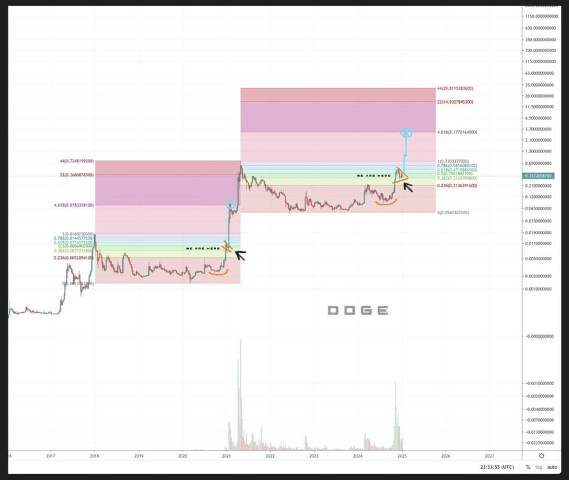Un grafico condiviso dal CEO degli Investimenti mostra un setup che potrebbe somigliare al rally di Dogecoin del 2021, con il potenziale di salire fino a $3.00 se il momentum rialzista continua. Un'impennata di questa magnitudine rappresenterebbe un rally di 10 volte rispetto al suo attuale livello di prezzo.