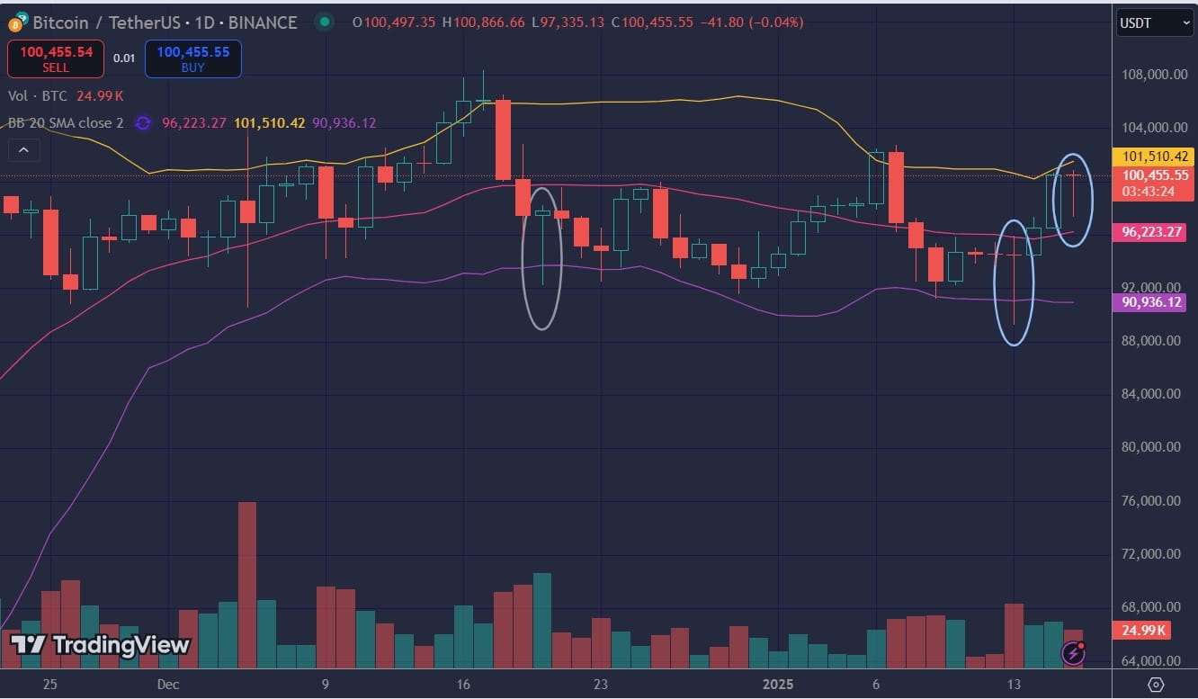 Oggi BTC ha formato un doji a libellula sul timeframe giornaliero come ha fatto il 13 gennaio e il 20 dicembre. C'è stata una mossa impulsiva potente il 14, ma il 21 il prezzo è sceso abbastanza rapidamente.