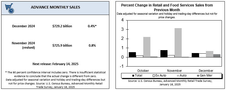 Il rapporto pubblicato il 16 gennaio 2025 dall’U.S. Census Bureau indica che le vendite al dettaglio negli Stati Uniti sono aumentate dello 0,4% nel dicembre 2024, raggiungendo i 729,2 miliardi di dollari. Questo aumento, seppur modesto, riflette consumi stabili, con un aumento del 3,9% rispetto a dicembre 2023.