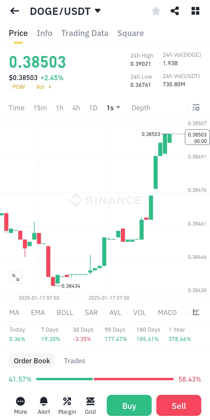 Dogecoin è scambiato a $0,38503, mostrando un guadagno giornaliero del +2,45%. L'intervallo di 24 ore si estende da $0,36761 (livello di supporto) a $0,39021 (livello di resistenza). Il volume di trading di 1,93B$DOGE e 730,80 milioni di USDT evidenziano una forte attività sul mercato.