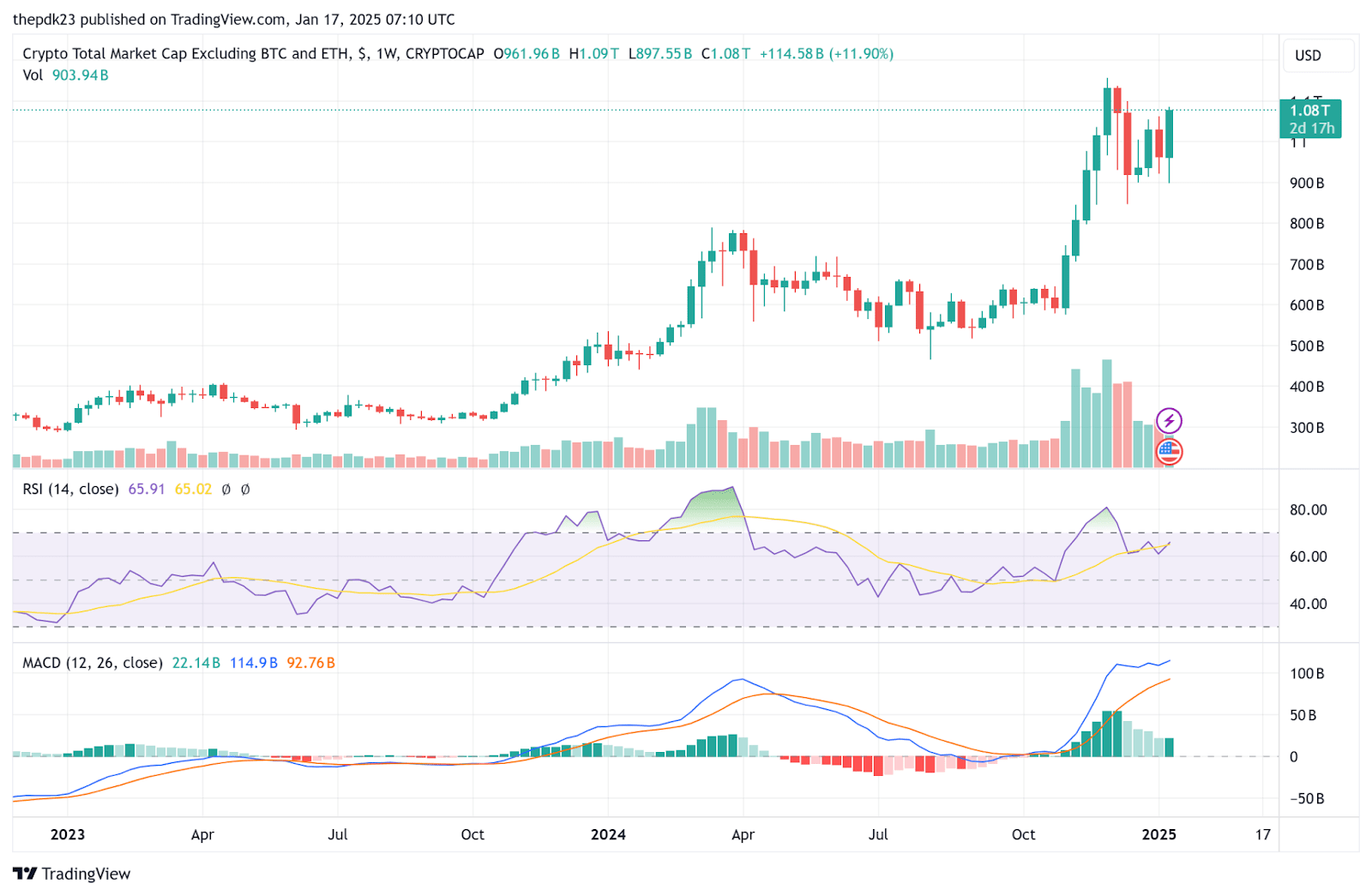 Nonostante la potenziale volatilità a breve termine causata dagli eventi di sblocco da $108 milioni, il trend più ampio nella capitalizzazione di mercato delle altcoin rimane rialzista. I grafici settimanali delle criptovalute escluse Bitcoin ed Ethereum evidenziano una traiettoria ascendente sostenuta:
