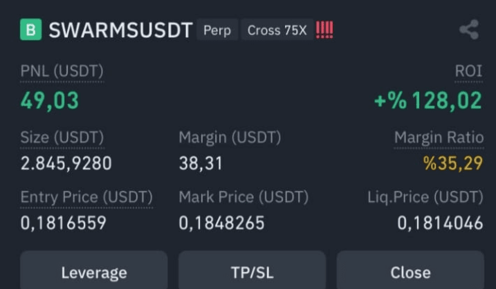 > "Un altro scambio di successo utilizzando la mia strategia di leva X su SWARMSUSDT. 35,29% di rapporto di margine e un prezzo di liquidazione sano. Continuiamo ad accumulare quei guadagni! #CryptoTrading #Strategia #Swarm"