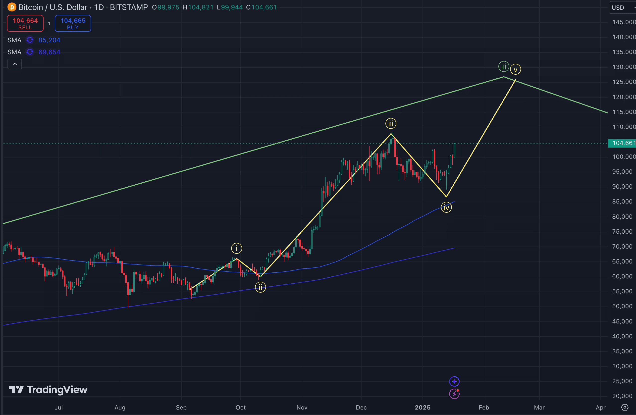 L'analisi di Glover utilizzando la teoria delle onde proietta il bitcoin a raggiungere $128.000 nei prossimi mesi seguendo il suo modello temporaneo a 5 onde, completando la sua onda più grande 3 nella sua tendenza crescente. Secondo la teoria delle onde, le tendenze di mercato si sviluppano in cinque onde, tre delle quali rappresentano la tendenza primaria e le altre costituiscono i ritiri.