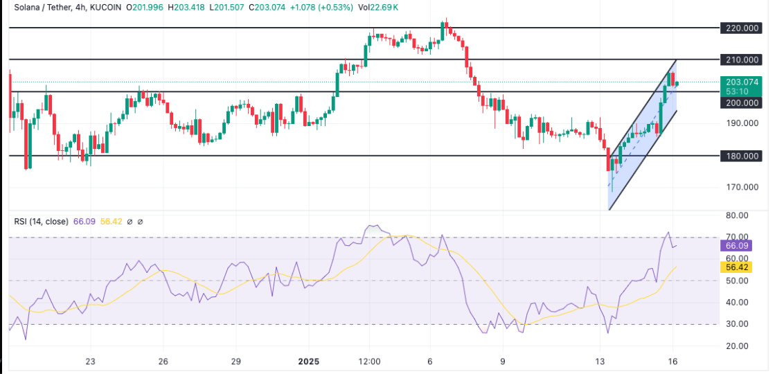 -SOL è salito oltre i 200$, raggiungendo un picco a 215$ prima di un leggero ritracciamento.