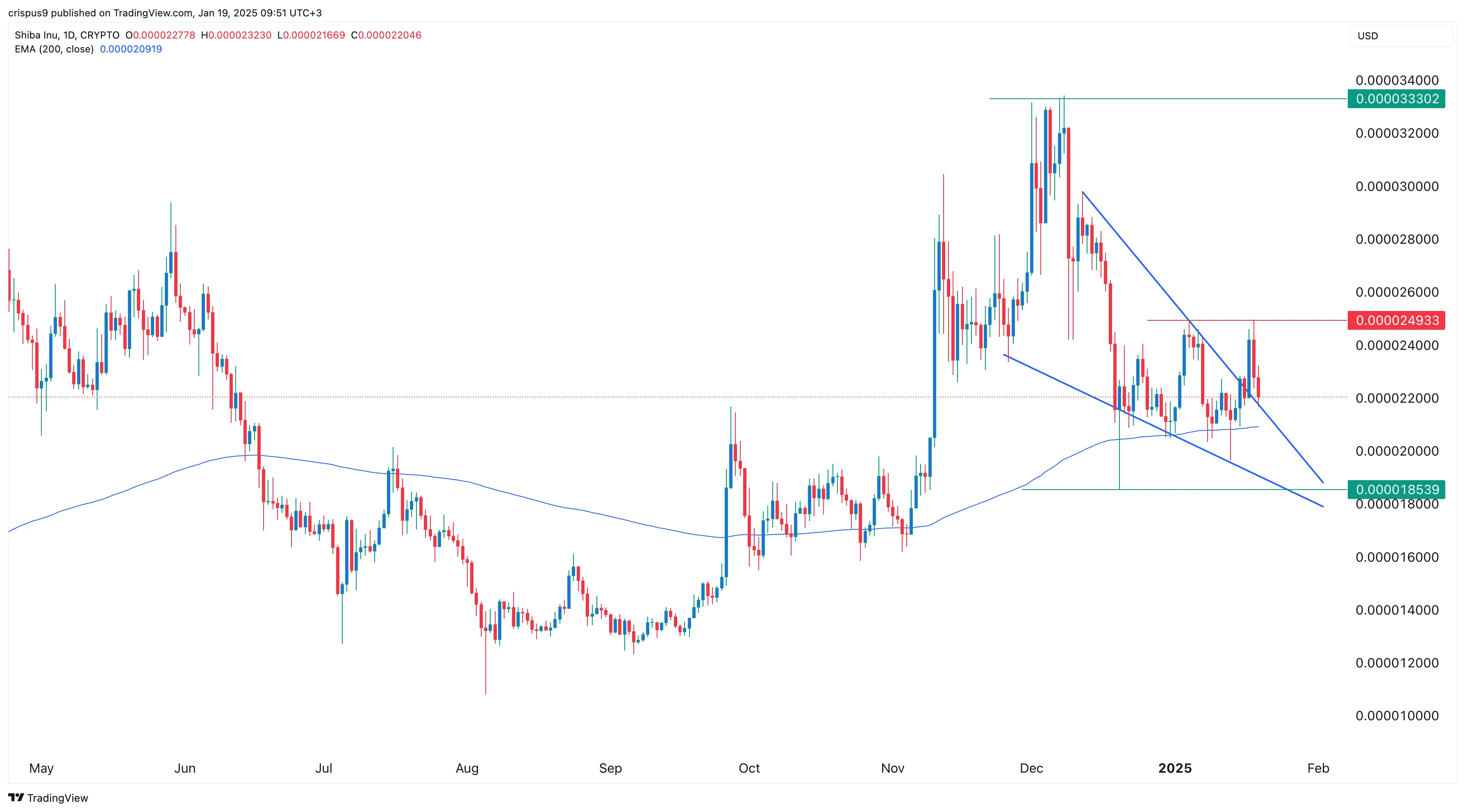 - Resistenza chiave a $ 0,000025: una rottura sopra questo livello potrebbe spingere SHIB verso $ 0,000033, il massimo di dicembre.