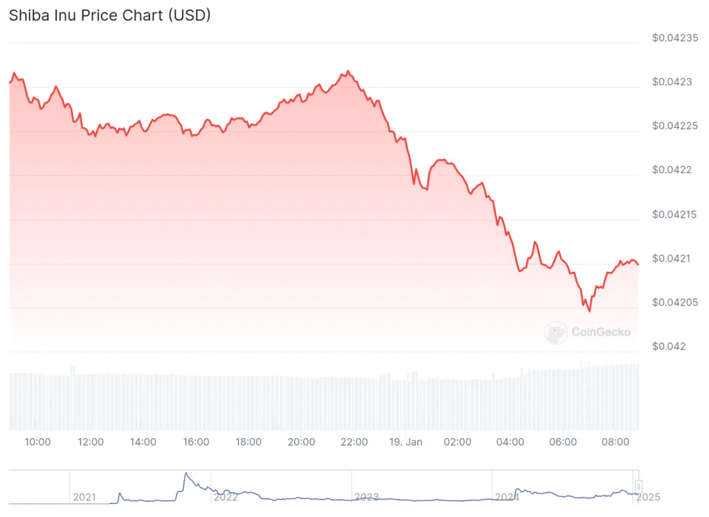 Shiba Inu ($SHIB ) ha subito un calo dei prezzi nel weekend, riflettendo tendenze più ampie in monete meme come Pudgy Penguins e Dogwifhat. In particolare, alcuni investitori hanno spostato l'attenzione su token come Official Trump ($TRUMP ), che ha catturato l'attenzione con una valutazione completamente diluita superiore a $ 71 miliardi, influenzando potenzialmente il ritiro di SHIB.