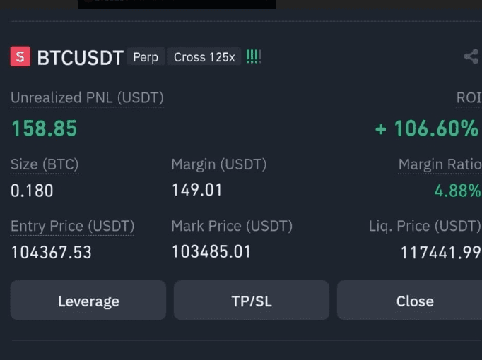 Volevo condividere un aggiornamento su un'operazione ad alto rischio e alto rendimento che sto attualmente gestendo. Sono long su BTCUSDT con leva 125x su uno swap perpetuo.
