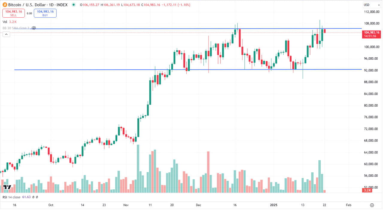 Dall'novembre 2024, il prezzo di BTC si è mosso lateralmente in un range tra $92.000 e $106.000 (vedi grafico 👇). Proprio ora, BTC è vicino al top di questo range, rendendo questo un momento chiave per il mercato.