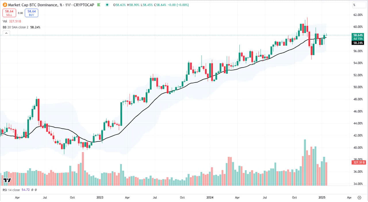 Il grafico settimanale della Dominanza BTC (BTC.D) (vedi grafico 👇) mostra che la maggior parte del denaro nel mercato è concentrato su BTC. Questo suggerisce che gli investitori stanno giocando sul sicuro, specialmente con il supporto di recenti eventi politici come l'inaugurazione del presidente Trump. BTC ha una probabilità del 60-65% di superare il suo precedente ATH.