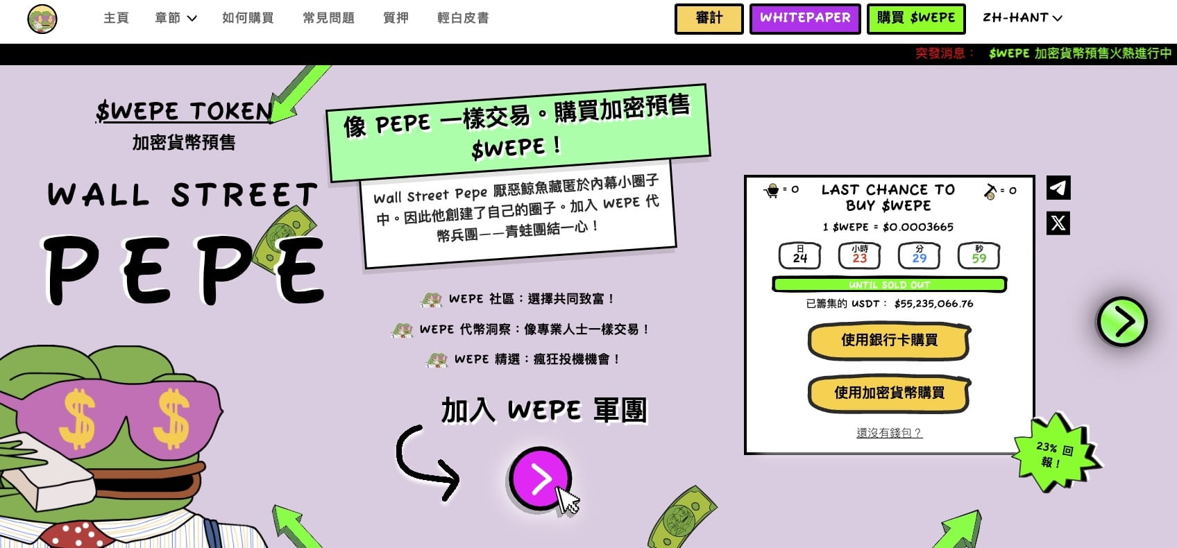 La prevendita di Wall Street Pepe sta procedendo rapidamente, avendo raccolto 2,4 milioni di dollari in sole 24 ore, con un importo totale che ha già superato i 57 milioni di dollari, restando solo 16 milioni di dollari dall'obiettivo. Il progetto ha attirato una vasta attenzione grazie al suo modello operativo incentrato sulla comunità e al suo tema finanziario unico.