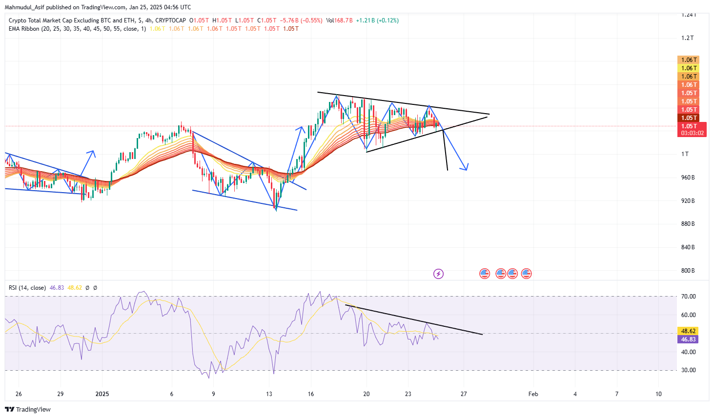 Se vediamo il mercato totale3 vediamo un pattern simmetrico. A causa della pressione di vendita. Pensiamo che se tutti vendono i loro scambi e monete, quelle candele creeranno una bandiera rialzista per il loro prossimo movimento. EMA e RSI mostrano una pressione discendente. Inoltre, BTC.D supporta questa analisi. Il che significa che forse possiamo vedere una pressione discendente minima nelle altcoin.