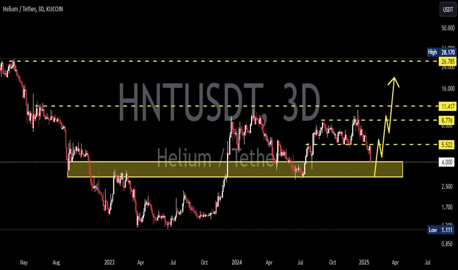 Guardando il timeframe 3D, stiamo vedendo un'azione interessante attorno a un livello di supporto chiave. Questa forte zona di supporto ha retto finora, il che è un segnale ottimistico per HNT.