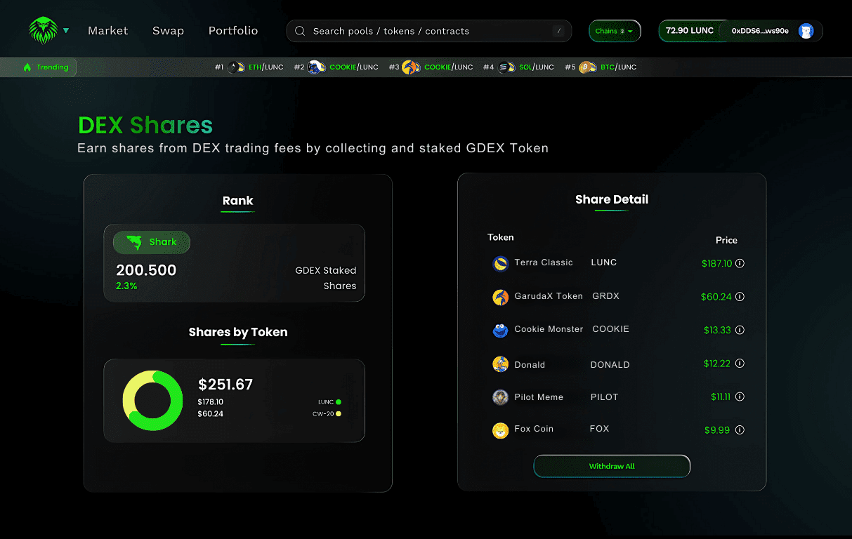 GDEX - Token di Condivisione dei Profitti: Nel tentativo di portare ulteriore utilità alla piattaforma, Garuda DeFi introduce il token GDEX. Questo token di condivisione dei profitti consentirà ai possessori di condividere il successo del DEX, creando un ecosistema incentivato per utenti e investitori.
