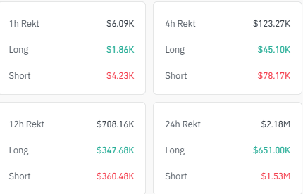 Secondo Coinglass, nelle ultime 24 ore, le liquidazioni totali hanno raggiunto i 2,18 milioni di dollari, di cui 651.000 dollari da posizioni lunghe e 1,53 milioni di dollari da posizioni corte. Ciò evidenzia uno squilibrio significativo, con le posizioni corte che subiscono perdite più ingenti, riflettendo la volatilità del mercato e il potenziale slancio rialzista che influenza le strategie dei trader.