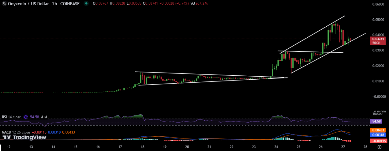 Il 23 gennaio, il prezzo di Onyxcoin ha rotto un pattern a triangolo simmetrico, con un conseguente aumento del 135%. Tuttavia, l'altcoin è poi rientrata nel triangolo prima di uscire nuovamente ieri, superando i livelli del 2022. Un breve ritracciamento si è verificato vicino al livello psicologico di $ 0,05000, causando un calo del 27%.