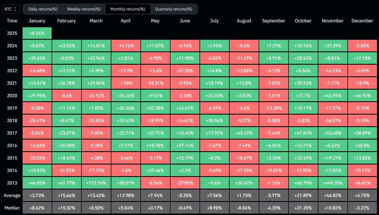 Nel contesto delle tendenze mensili, i dati storici mostrano che gennaio ha registrato un rendimento medio del 3,73%, mentre febbraio è aumentato al 15,66%. Questo schema fornisce ulteriori informazioni sulle dinamiche stagionali che spesso influenzano i movimenti del prezzo del Bitcoin, soprattutto all'inizio dell'anno.