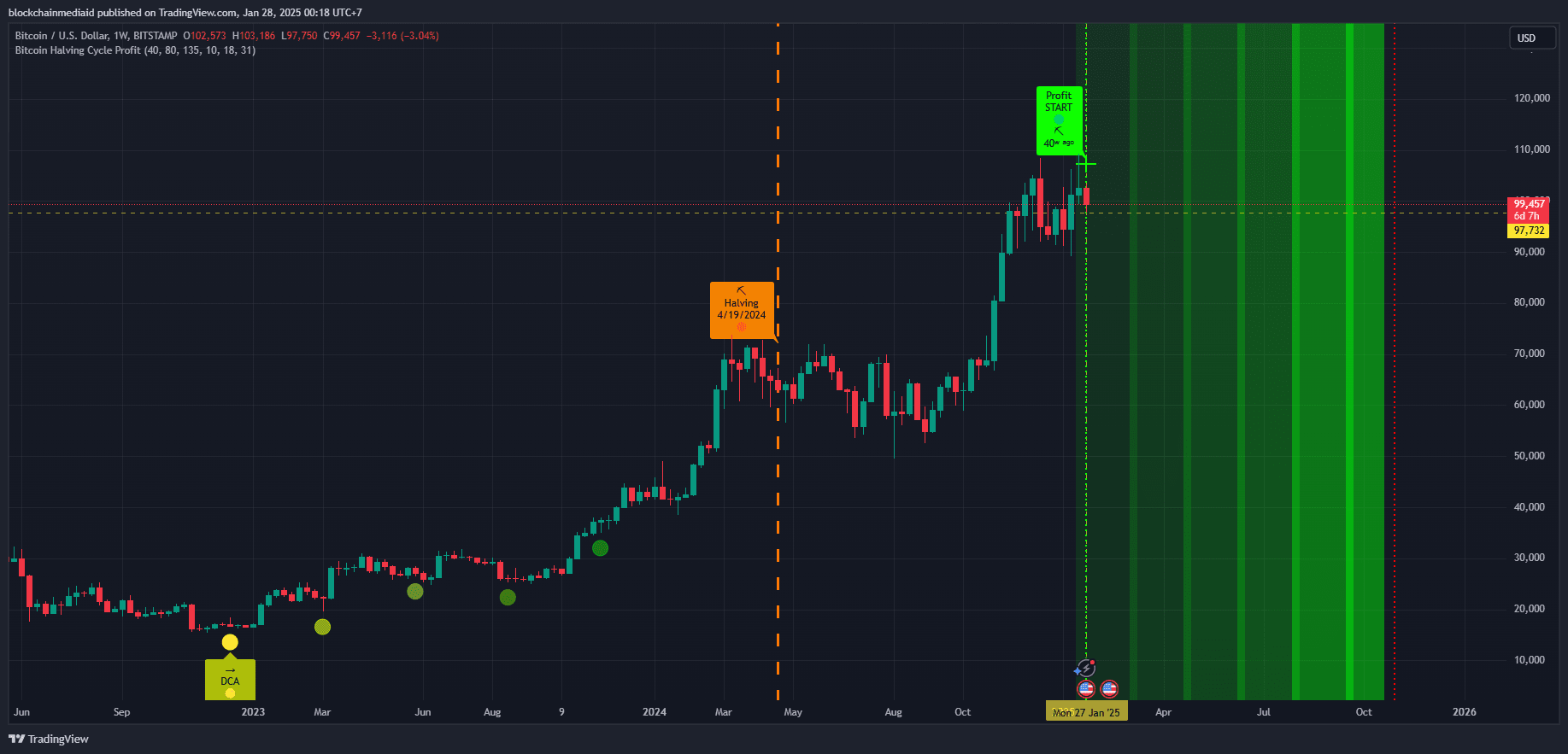 Sulla base di tale indicatore, l'azione ottimale per realizzare profitti inizia 40 settimane dopo il dimezzamento. Supponendo che una settimana sia composta da sette giorni, allora 40 settimane dal 19 aprile 2024 cadono il 24 gennaio 2025. Durante questo periodo, i crolli del mercato delle criptovalute sono spesso influenzati dalla pressione di vendita, perché l'aumento dei prezzi di Bitcoin di solito raggiunge un punto redditizio nel ciclo post-halving.